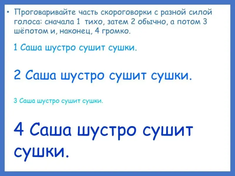 Проговаривайте часть скороговорки с разной силой голоса: сначала 1 тихо, затем 2 обычно, а потом 3 шёпотом и, наконец, 4 громко. (Слайд 32)
