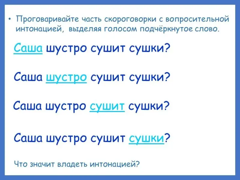 Проговаривайте часть скороговорки с вопросительной интонацией, выделяя голосом подчёркнутое слово.