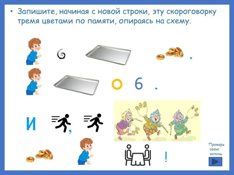 Запишите, начиная с новой строки, эту скороговорку тремя цветами по памяти, опираясь на схему.
