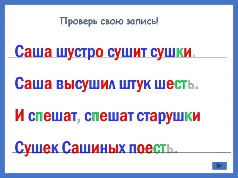д). Запись скороговорки тремя цветами.