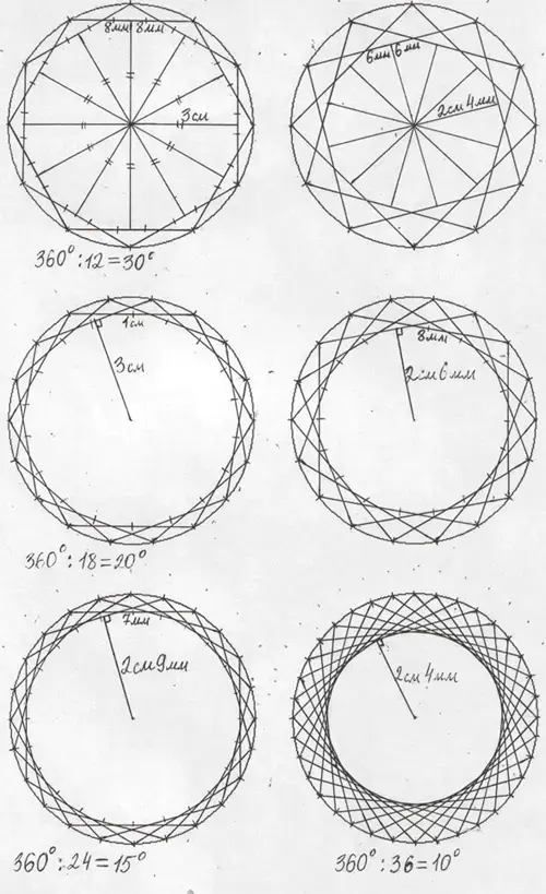 Если окружность разделить на равные части и провести все хорды равной длины, то они от центра окружности находятся на одинаковом расстоянии. Середины хорд лежат на окружности с тем же центром, что и исходная окружность. Чем длиннее хорда, тем меньше получится центральное отверстие. Изменяя длину хорды и количество точек, на окружностях с равным диаметром можно получить разнообразные узоры. (Приложение)