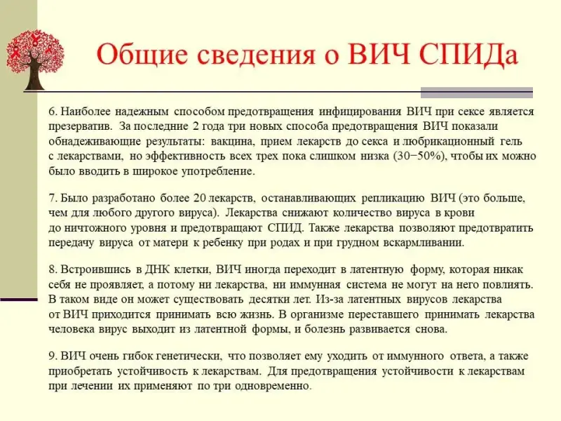 7. Было разработано более 20 лекарств, останавливающих репликацию ВИЧ (это больше, чем для любого другого вируса). Лекарства снижают количество вируса в крови до ничтожного уровня и предотвращают СПИД. Также лекарства позволяют предотвратить передачу вируса от матери к ребенку при родах и при грудном вскармливании.