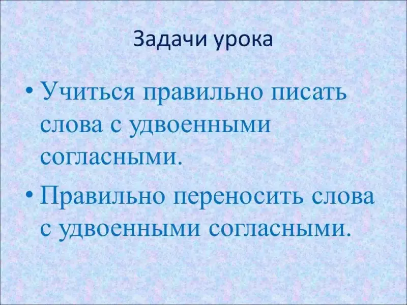 - Обучающая: формировать навык правописания слов с удвоенными согласными буквами в корне, умение правильного переноса слов в местах удвоенных согласных.