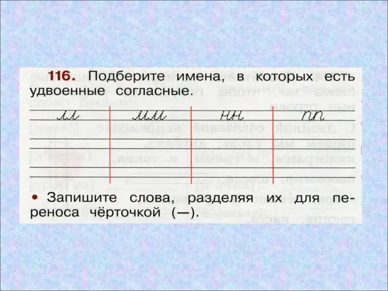 - тренировать обучающихся в написании слов с двойными согласными, употреблении их в речи.