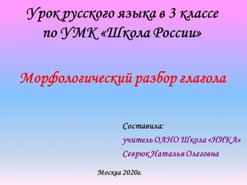 В данной работе рассматривается алгоритм морфологического разбора глагола, как самостоятельной части речи. Презентация разработана для учащихся третьего класса (система заочного или дистанционного обучения). Однако, рассматриваемый наглядный алгоритм может быть использован как в рамках урочной системы, так и в последующих классах (4-5) для уточнения и повторения изученного материала.
