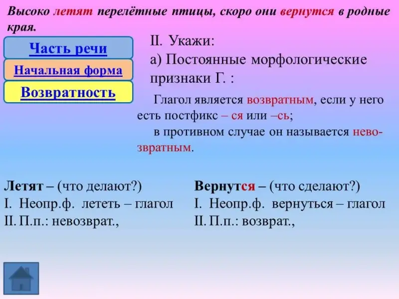 - возвратность, вид, спряжение (постоянные признаки);