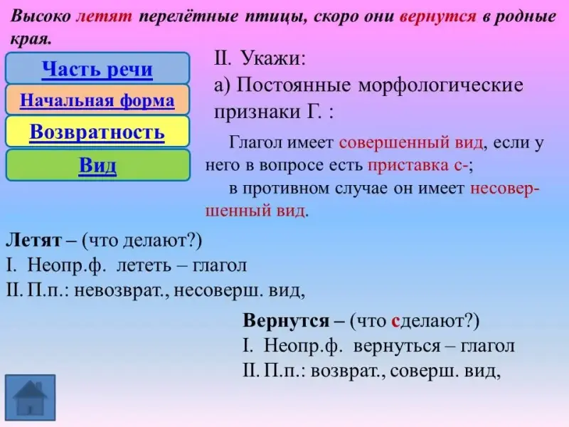 Вторая сложность, которую испытывают обучающиеся при выполнении морфологического анализа, является продолжением первой - определение вида глагола. А ведь нужно всего лишь правильно задать вопросы к неопределённой форме: что делать? или что сделать?
