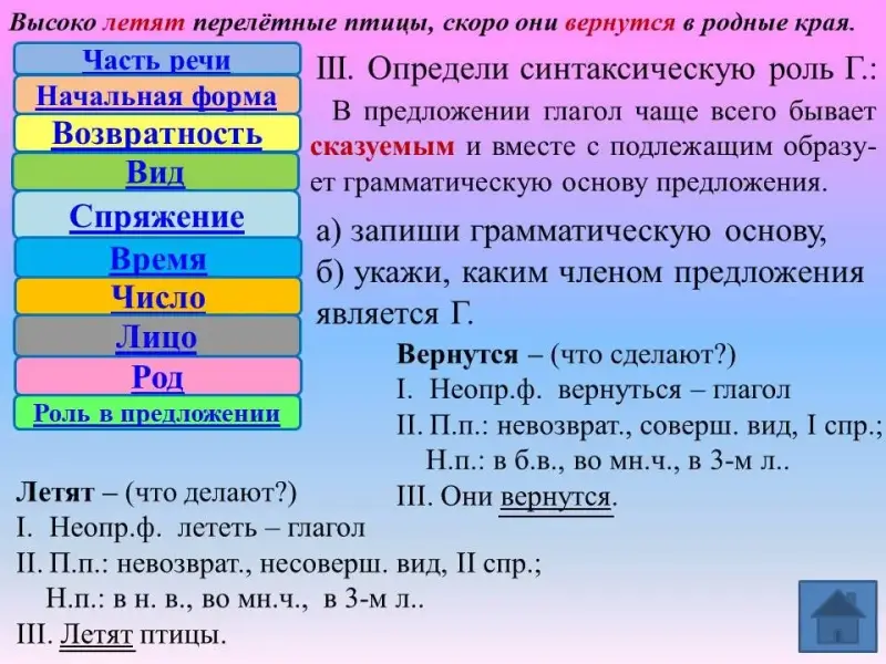 Определение синтаксической роли глагола к третьему классу так же у большинства обучающихся сложности уже не вызывает. В предложении глагол всегда согласуется с подлежащим, образовывая грамматическую