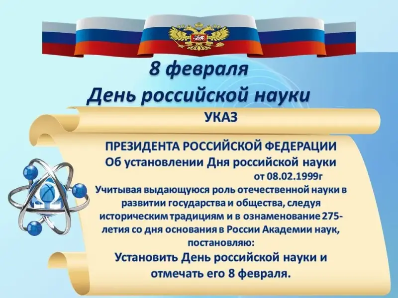 День российской науки в Российской Федерации приурочен к историческому событию 8 февраля, ровно 298 лет назад была образована Академия наук России.