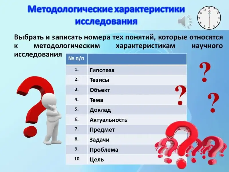 Из представленного перечня Вам необходимо выбрать и записать номера тех понятий, которые относятся к методологическим характеристикам научного исследования.