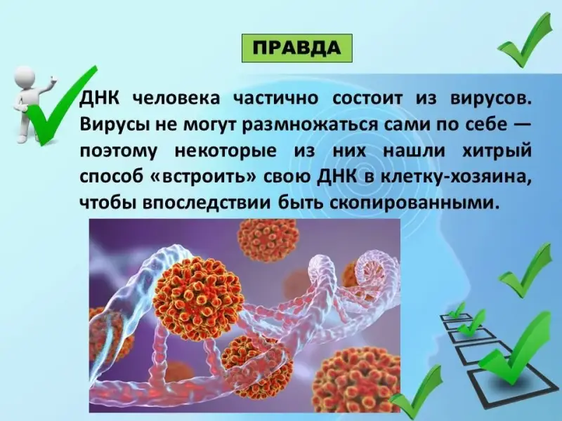 Правильный ответ. ПРАВДА. ДНК человека частично состоит из вирусов. Вирусы не могут размножаться сами по себе - поэтому некоторые из них нашли хитрый способ «встроить» свою ДНК в клетку-хозяина, чтобы впоследствии быть скопированными.