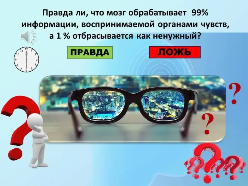 3 вопрос. Правда ли, что мозг обрабатывает 99% информации, воспринимаемой органами чувств, а 1 % отбрасывается как ненужный?