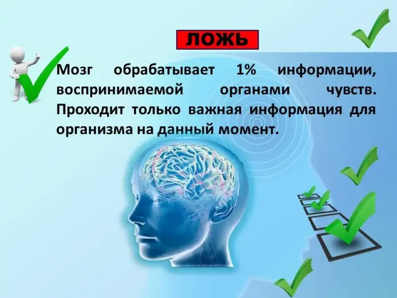 Правильный ответ. ЛОЖЬ. Мозг обрабатывает 1% информации, воспринимаемой органами чувств. Проходит только важная информация для организма на данный момент.