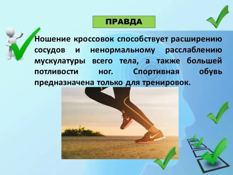 Правильный ответ. ПРАВДА. Ношение кроссовок способствует расширению сосудов и ненормальному расслаблению мускулатуры всего тела, а также большей потливости ног. Спортивная обувь предназначена только для тренировок.