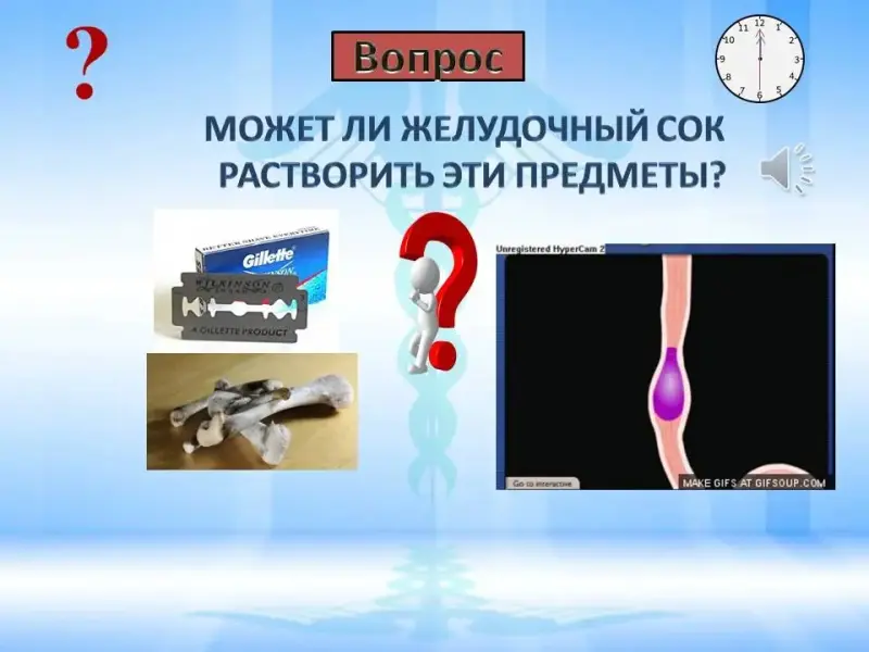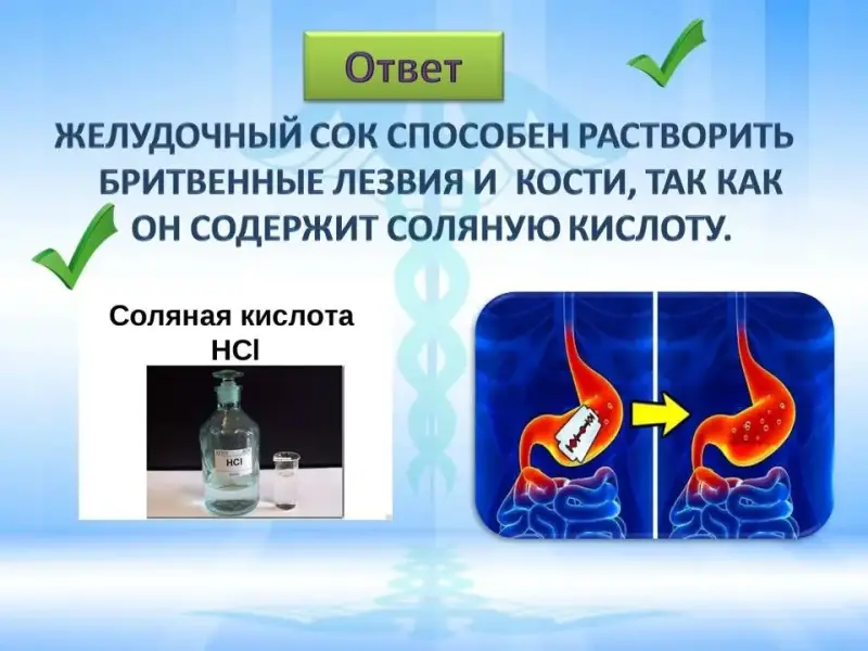 Правильный ответ: желудочный сок способен растворить бритвенные лезвия и кости, так как он содержит соляную кислоту.