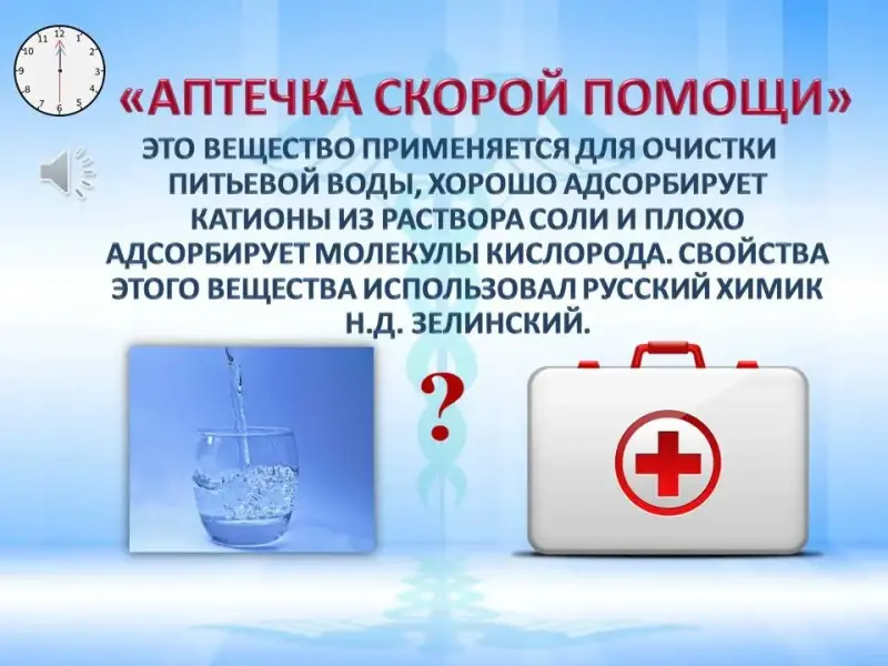 Это вещество применяется для очистки питьевой воды, хорошо адсорбирует катионы из раствора соли и плохо адсорбирует молекулы кислорода. Свойства этого вещества использовал русский химик Николай Дмитриевич Зелинский.