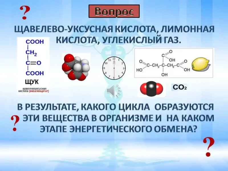 На экране представлены продукты метаболизма: щавелево-уксусная кислота, лимонная кислота, углекислый газ.