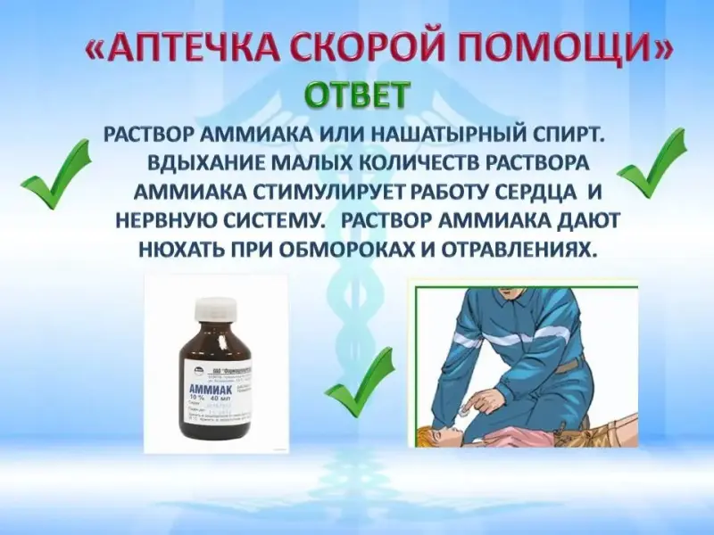 Правильный ответ: раствор аммиака или нашатырный спирт.Вдыхание малых количеств раствора аммиака стимулирует работу сердца и нервную систему. Поэтому раствор аммиака дают нюхать при обмороках и отравлениях.