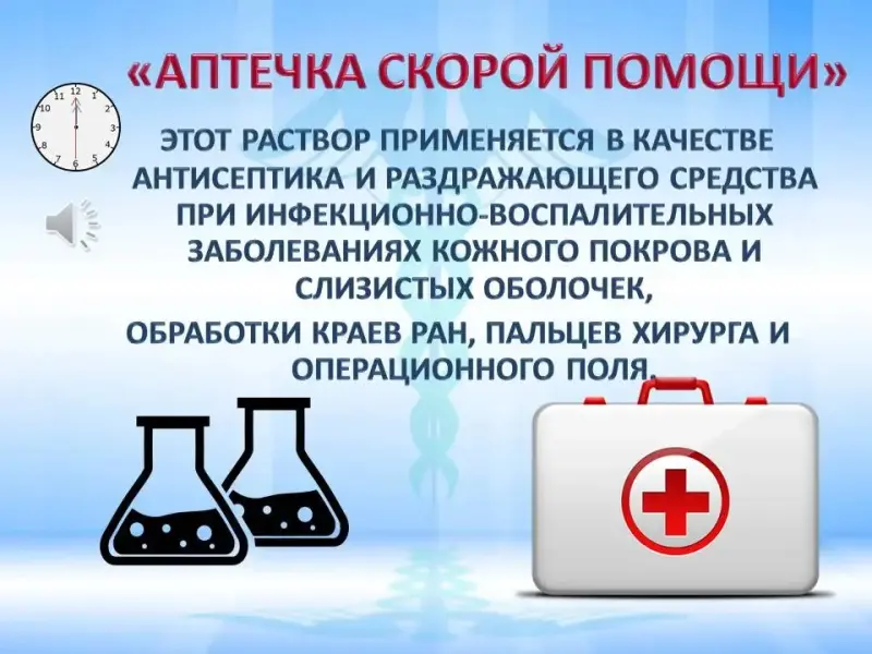 Этот раствор применяется в качестве антисептика и раздражающего средства при инфекционно-воспалительных заболеваниях кожного покрова и слизистых оболочек, обработки краев ран, пальцев хирурга и операционного поля.