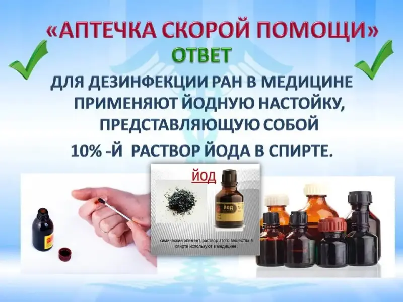 Правильный ответ: Для дезинфекции ран в медицине применяют йодную настойку, представляющую собой 10% -й раствор йода в спирте.