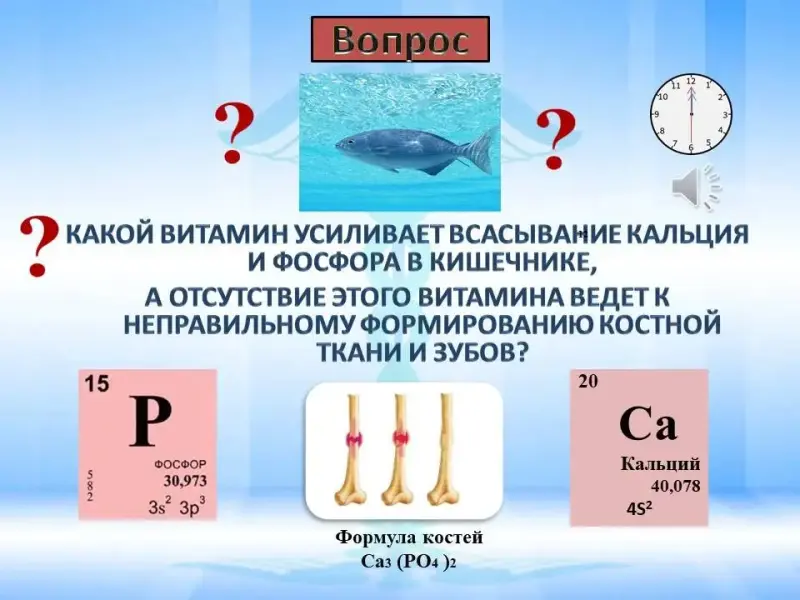 Вопрос: Какой витамин усиливает всасывание кальция и фосфора в кишечнике? Отсутствие этого витамина ведет к неправильному формированию костной ткани и зубов.