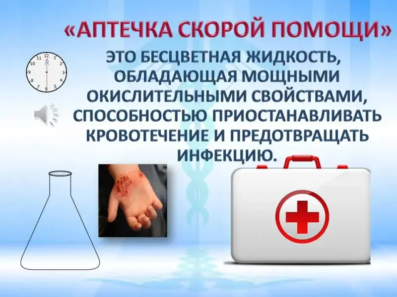 Это бесцветная жидкость, обладающая мощными окислительными свойствами, способностью приостанавливать кровотечение и предотвращать инфекцию.