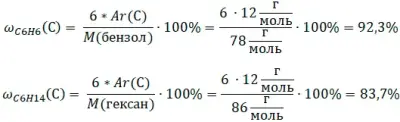 Ход работы: Сравним массовую долю углерода в бензоле (C6H6) и алкане с таким же числом атом атомов углерода (C6H14 - гексан):