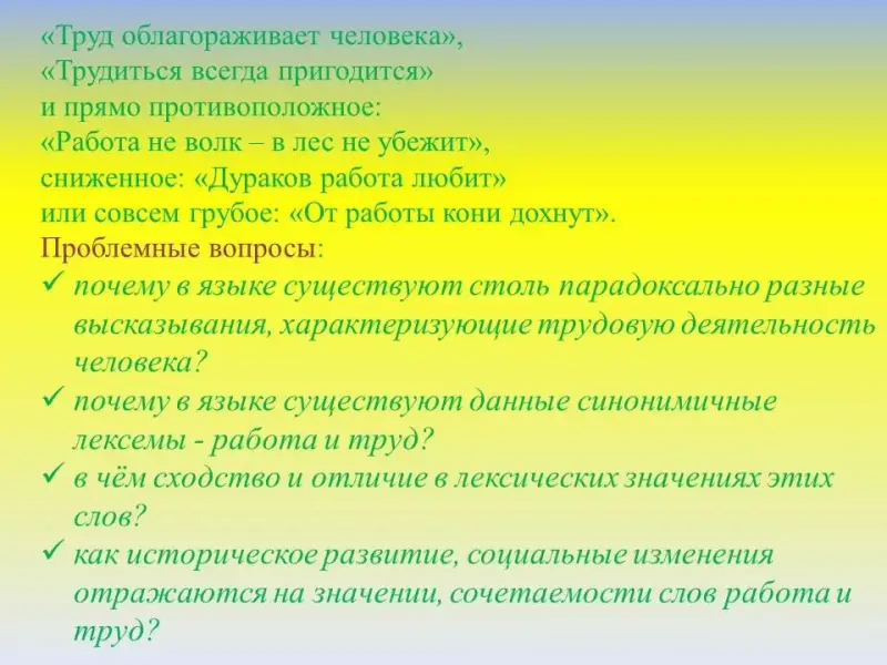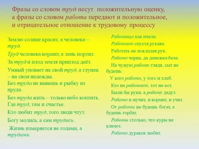 Часто в жизни мы слышим: «Труд облагораживает человека», «Трудиться всегда пригодится» и прямо противоположное: «Работа не волк - в лес не убежит», сниженное: «Дураков работа любит» или совсем грубое: «От работы кони дохнут». Невольно возникает вопрос: почему в языке существуют столь разные высказывания, характеризующие трудовую деятельность человека, и почему трудовой процесс обозначается разными словами (работа и труд)? Считаем, что данная проблема может быть интересна широкому кругу носителей русского языка, может привлечь внимание к более глубокому изучению литературы и истории народа, к бережному отношению к родному русскому языку.