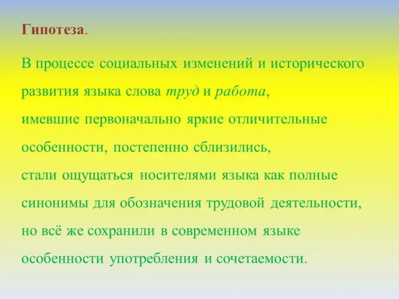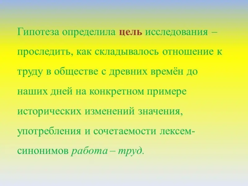 Гипотеза определила цель исследования - проследить, как складывалось отношение к труду в обществе с древних времён до наших дней на конкретном примере исторических изменений значения, употребления и сочетаемости лексем-синонимов работа - труд.