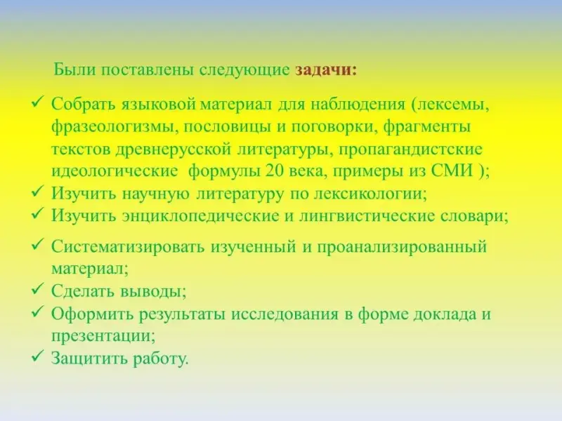 - Собрать языковой материал для наблюдения (лексемы, фразеологизмы, пословицы и поговорки, фрагменты текстов древнерусской литературы, пропагандистские идеологические формулы 20 века, примеры из СМИ );