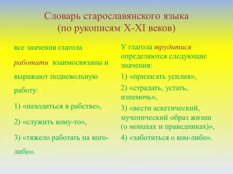 Изучив словари, проанализировав особенности употребления слов работа и труд выяснили, что у глагола трудитися до X века отсутствуют все значения слова «работать», а для обозначения трудовой деятельности также используется слово «делати». В Словаре старославянского языка X-XI веков (1994) все значения глагола работати взаимосвязаны и выражают подневольную работу: