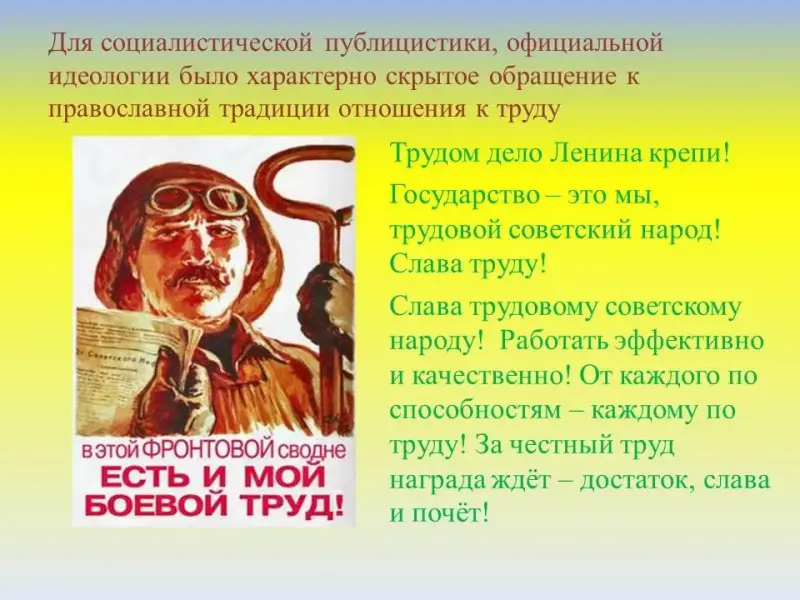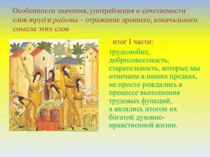 То есть труд - это не только необходимая деятельность для добывания «хлеба насущного», но и деятельность, связанная с усилием, требующая страдания, возвышающая человека. Интересно наличие в слове возвратного суффикса -ся, показывающего, что процесс направлен на себя: трудиться - «трудить себя». Таким образом, труд - это свободная, неподневольная деятельность свободного человека, норма для человеческой жизни, и именно слово трудъ, трудитися в памятниках древнерусской литературы XI-XVII вв. чаще всего употребляется для обозначения трудовой деятельности и ежедневных забот не только монахов, но и обычных людей.