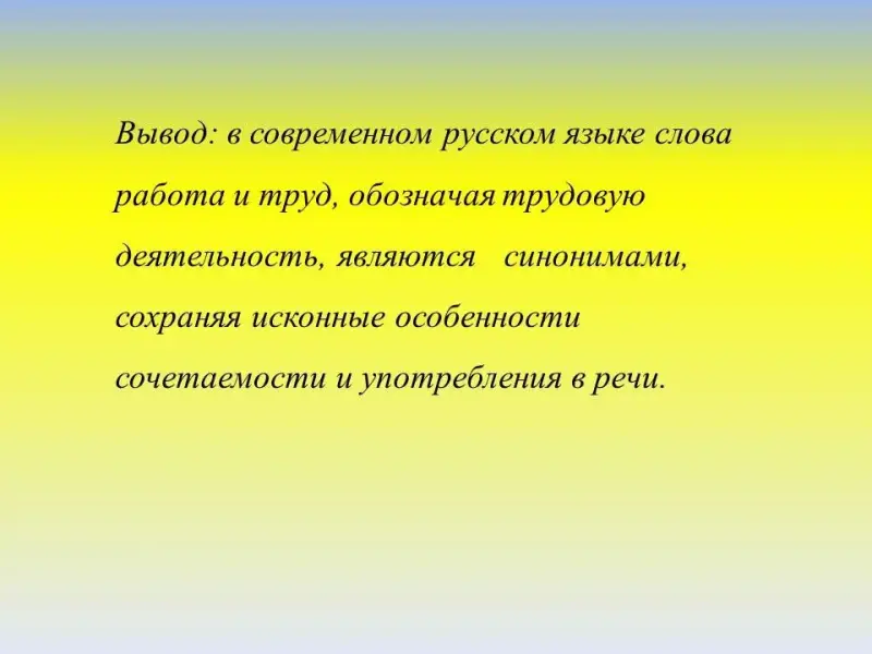 Проведенный анализ литературных источников на предмет особенностей употребления слов труд и работа выявил, что в языке продолжается изменение значения слова труд: от наименования тяжёлых физических усилий, страдания - к обобщённому названию трудовой деятельности, сохраняя при этом духовно-нравственный смысл. Труд считался главной ценностью человеческой жизни, основой нравственности человека, благим делом, в котором главное духовное, а не материальное начало. По убеждению православных подвижников, труд преобразовывал душу человека, приближал к Божественному идеалу.