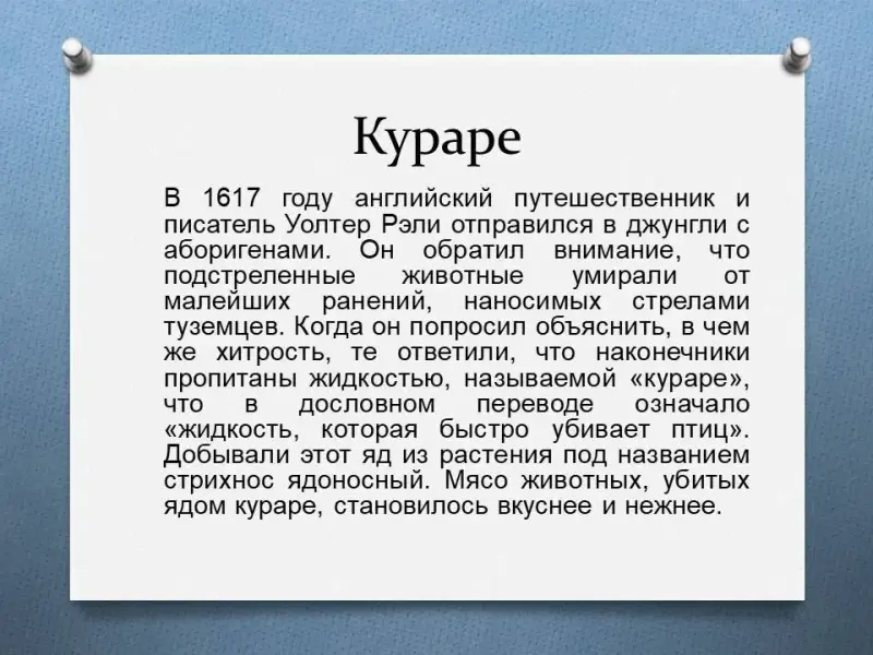 В 1617 году английский путешественник и писатель Уолтер Рэли отправился в джунгли с аборигенами. Он обратил внимание, что подстреленные животные умирали от малейших ранений, наносимых стрелами туземцев. Когда он попросил объяснить, в чем же хитрость, те ответили, что наконечники пропитаны жидкостью, называемой «кураре», что в дословном переводе означало «жидкость, которая быстро убивает птиц». Добывали этот яд из растения под названием стрихнос ядоносный. Мясо животных, убитых ядом кураре, становилось вкуснее и нежнее