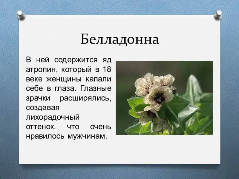 В ней содержится яд атропин, который в 18 веке женщины капали себе в глаза. Глазные зрачки расширялись, создавая лихорадочный оттенок, что очень нравилось мужчинам.