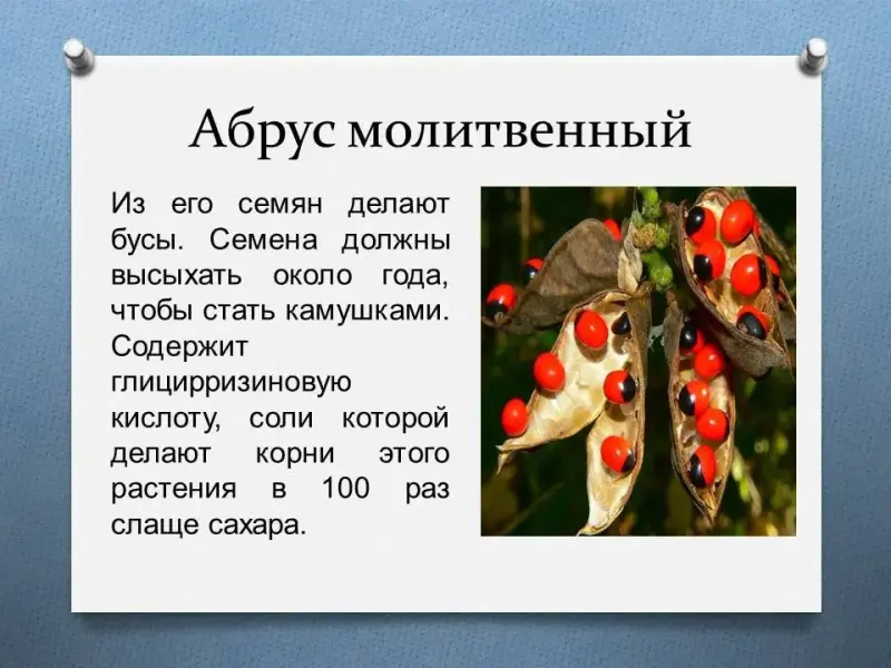 Из его семян делают бусы. Семена должны высыхать около года, чтобы стать камушками. Содержит глицирризиновую кислоту, соли которой делают корни этого растения в 100 раз слаще сахара.