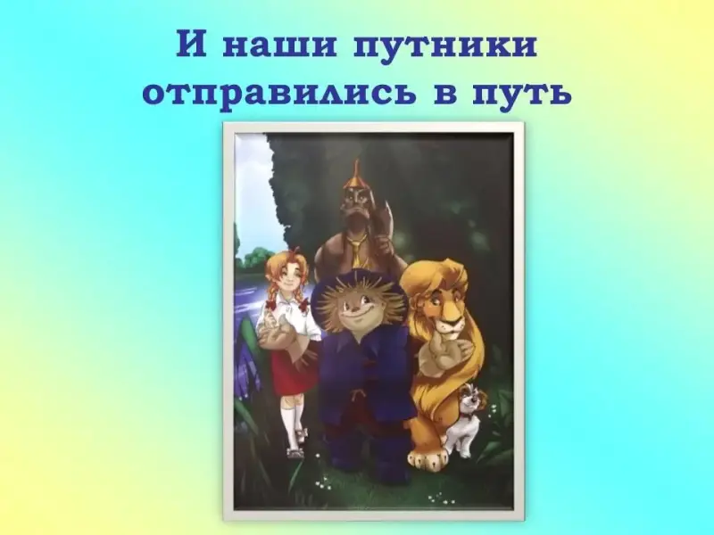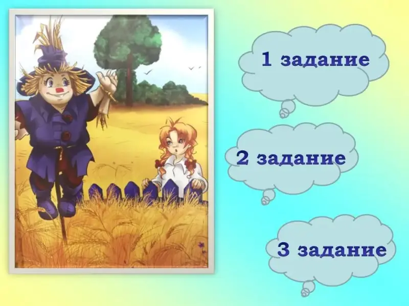 - Итак, Дороти и Тото отправились в путь по дороге из жёлтого кирпича. Вскоре они устали и решили отдохнуть. Дороти присела на зелёную траву у дороги. Недалеко в центре поля она увидела чучело.