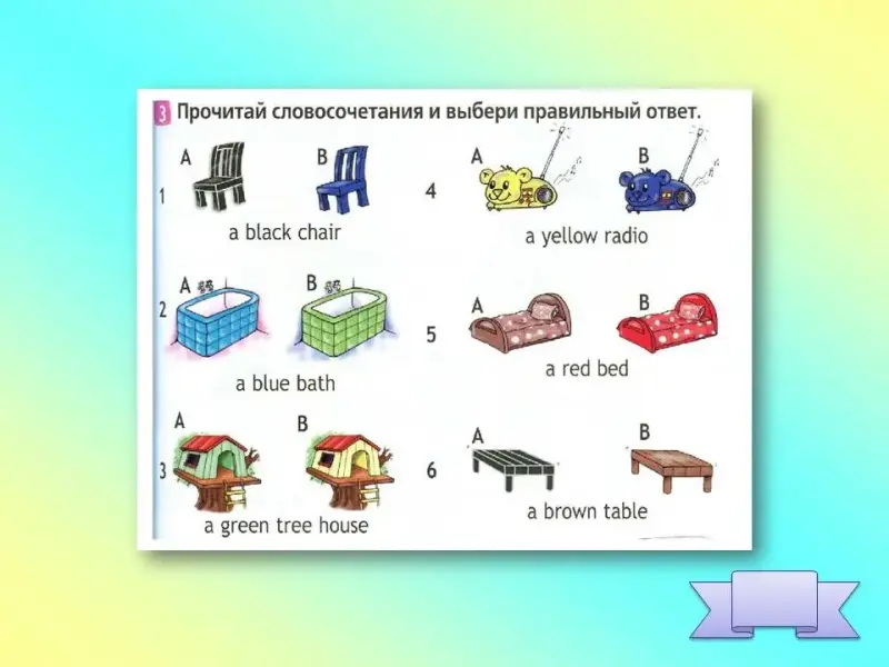 - Прочитай словосочетание и выбери правильный ответ: a black chair, a yellow radio, a blue bath, a red bed, a green tree house, a brown table [3].