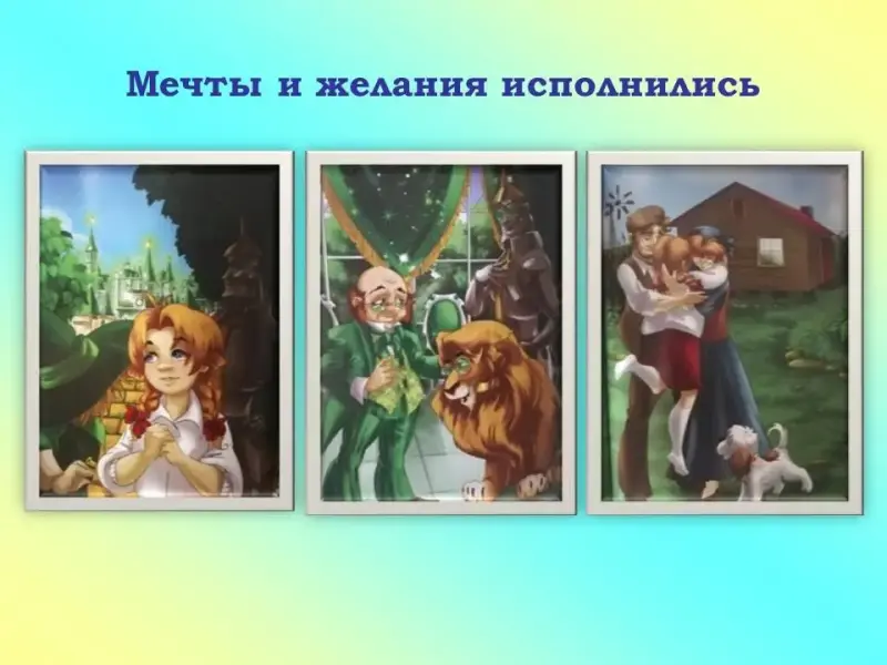 - Страшила - получил свои мозги, Дровосек - сердце, Трусливый лев - смелость. А девочка Дороти и Тото смогли вернуться домой в Канзас.