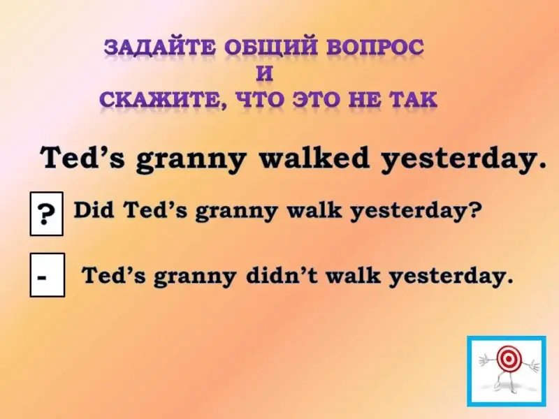 8. Задайте общий вопрос и скажите, что это не так. Did Ted's granny walk yesterday?