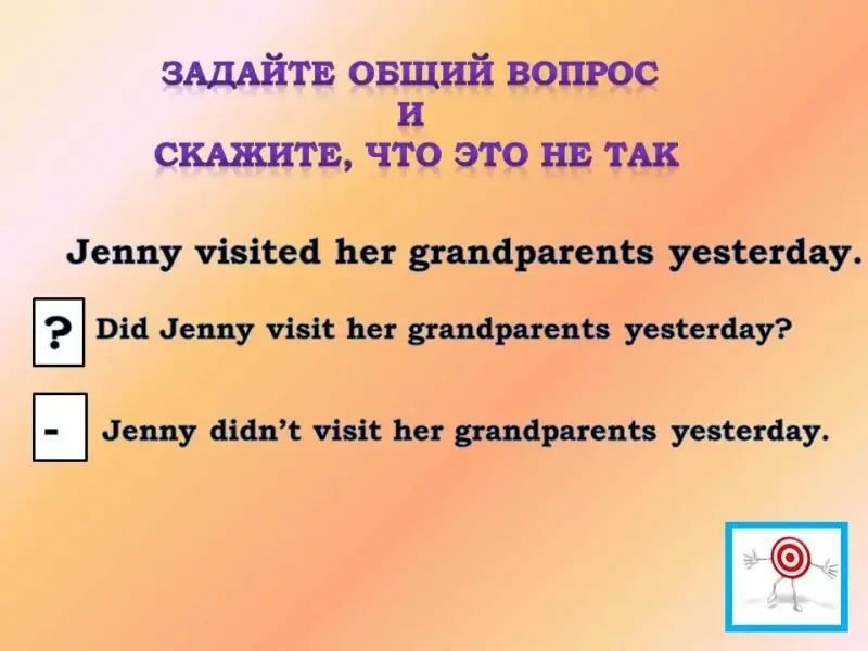 10. Задайте общий вопрос и скажите, что это не так. Did Jenny visit her grandparents yesterday.
