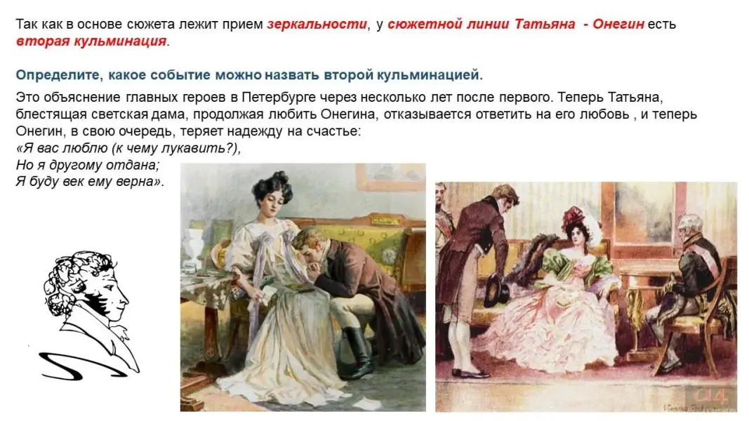«Кульминацией главы является объяснение Евгения в любви к Татьяне - строка «Бледнеть и гаснуть … вот блаженство!». Эта строка делит всю восьмую главу на две части - в первой 477 строк, а во второй - 295 строк.