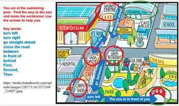 They are to make sentences using the Key words and Imperative Mood. They use the cut-out arrows to create a route and give instructions how to reach the place.