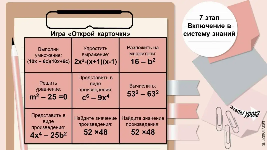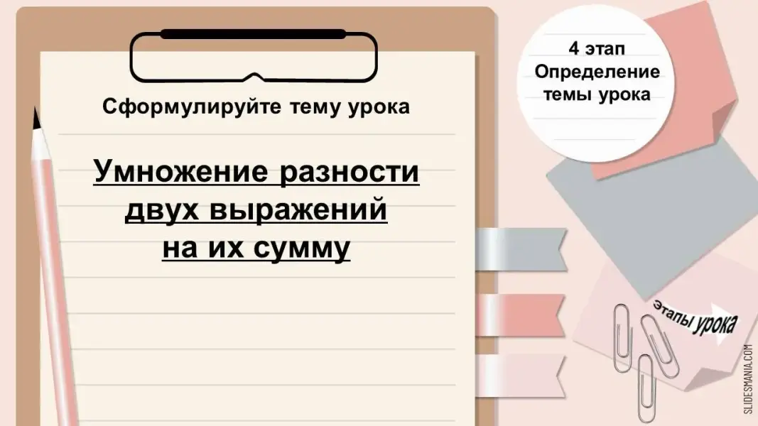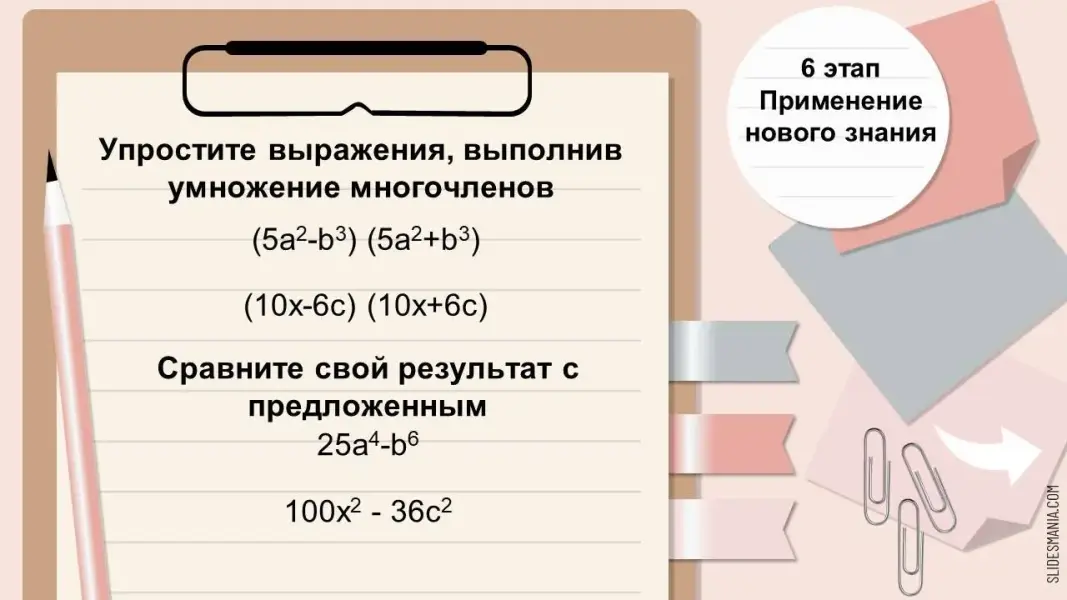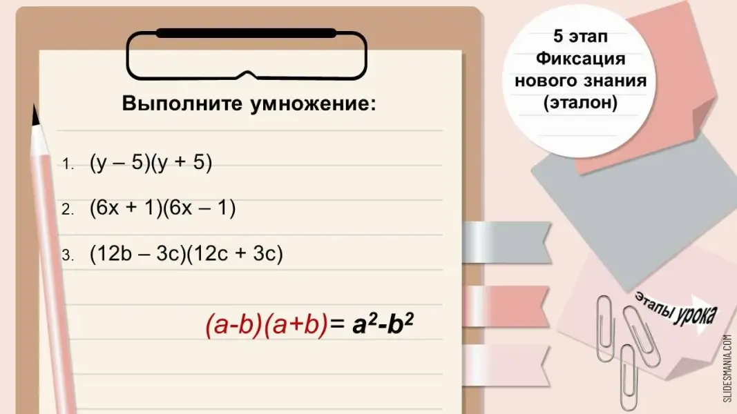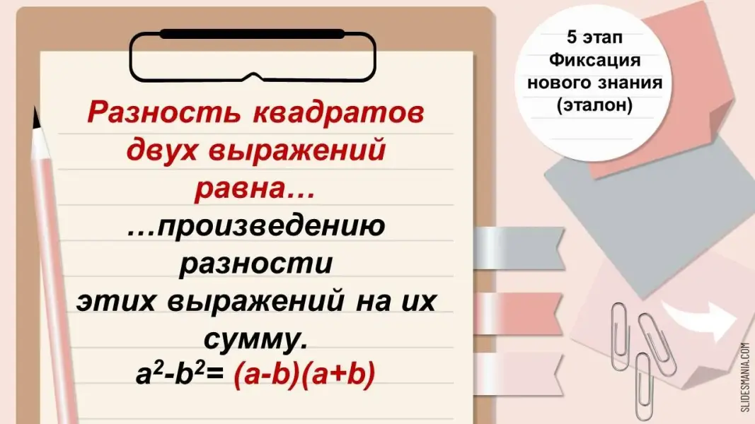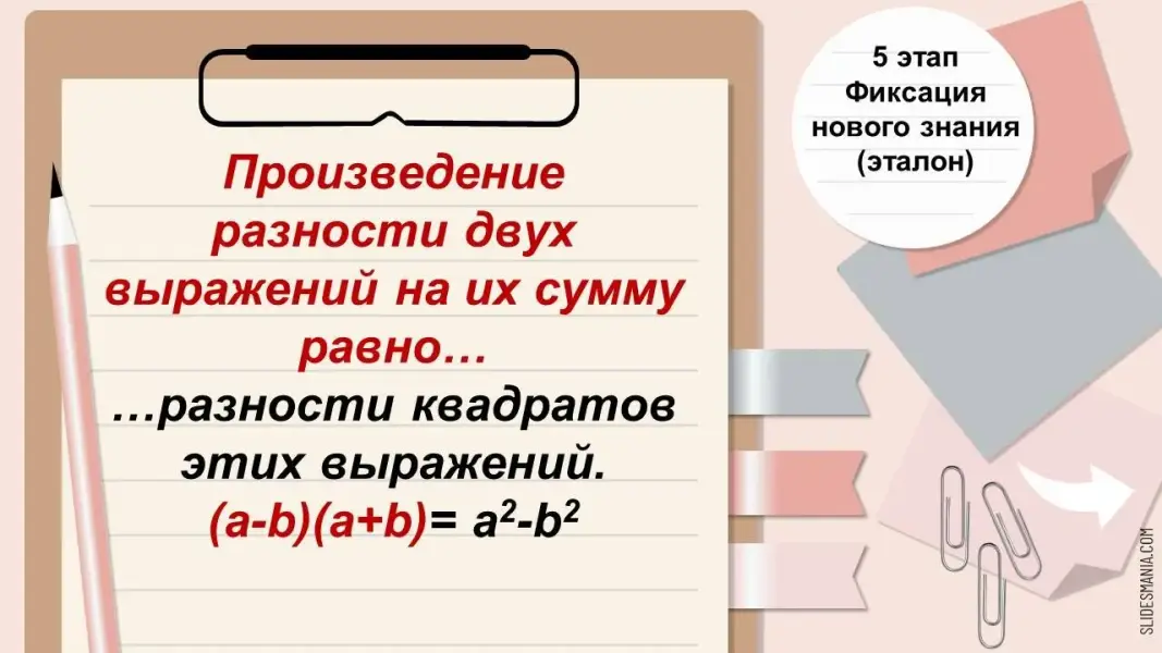 Умножение разности двух выражений на их сумму (урок открытия нового знания)