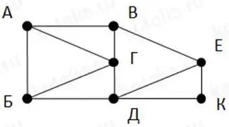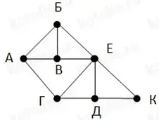 9. На рисунке справа схема дорог Н-ского района изображена в виде графа, в таблице содержатся сведения о длинах этих дорог (в километрах). Так как таблицу и схему рисовали независимо друг от друга, то нумерация населённых пунктов в таблице никак не связана с буквенными обозначениями на графе. Укажите кратчайший путь из пункта Б в пункт Ж. В ответе перечислите все населённые пункты, через которые проходит путь. Например, путь из Г в В через А и Б записывается как ГАБВ.