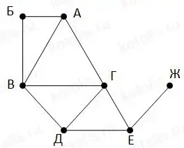 8. На рисунке справа схема дорог Н-ского района изображена в виде графа, в таблице содержатся сведения о длинах этих дорог (в километрах). Так как таблицу и схему рисовали независимо друг от друга, то нумерация населённых пунктов в таблице никак не связана с буквенными обозначениями на графе. Укажите кратчайший путь из пункта Б в пункт Ж. В ответе перечислите все населённые пункты, через которые проходит путь. Например, путь из Г в В через А и Б записывается как ГАБВ.