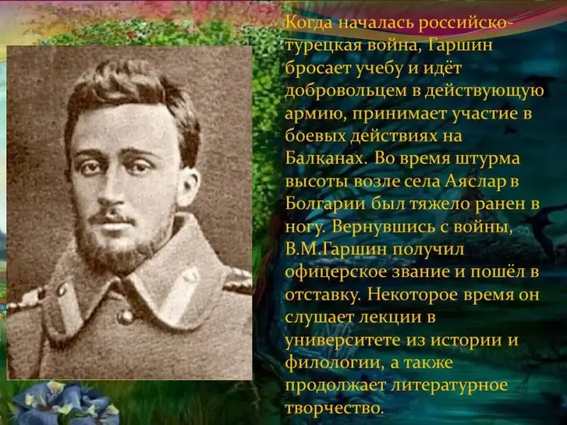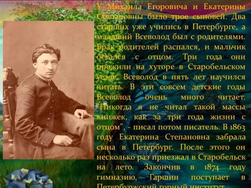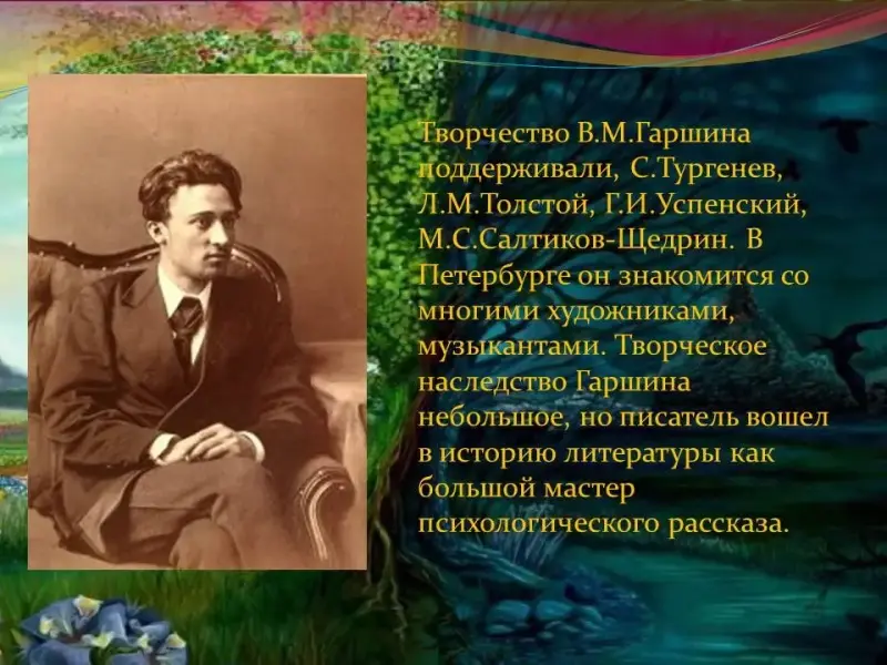 Предлагает прочитать посмотреть на портрет писателя, интересуется, знаком ли он детям. Просит прочитать его высказывание, предлагает узнать в толковом словаре значение слова «миссия». Если ты оставил после себя след красоты души, то будь уверен, что выполнил свою миссию на земле… Просит объяснить смысл высказывания. Обращает внимание/ подтверждает, что слова принадлежат В.М.Гаршину, просит назвать знакомые произведения автора. Знакомит учащихся с биографией писателя. |