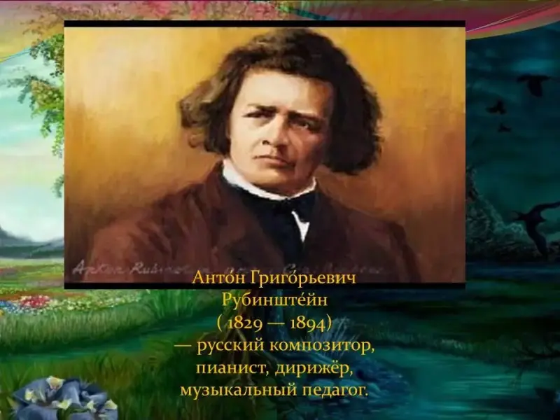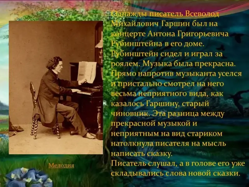 Дает информацию о знакомстве В.М.Гаршина с известными людьми того времени, в т.ч. с композитором А.Г.Рубинштейном. Предлагает, закрыв глаза, послушать «Мелодию» А.Рубинштейна в исполнении В.А.Новиков Просит поделиться впечатлениями от прослушанной музыки. Знакомит с историей, произошедшей с Гаршиным на концерте композитора. |