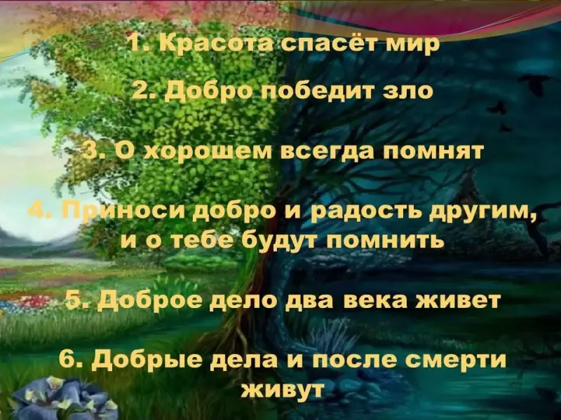 | Обращает внимание на фон слайда, просит выдвинуть предположения о его значении, помогает определиться с выводами. | Делают предположения, приходят к выводу, что картинка иллюстрирует добро и зло. | |||