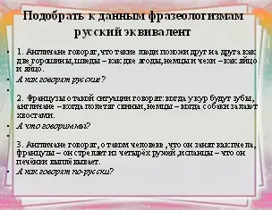 - Cейчас вам необходимо будет подобрать к данным фразеологизмам русский эквивалент.